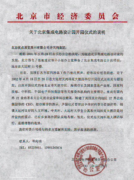 首屆呼叫中心運營管理研討會組委會 重要通告 本次大會組委會及會議舉辦地點“天鴻科園大酒店”日前接到北京市人民政府通知,由于“北京集成電路設計園開園儀式”將于2002年4月18日至4月20日在大運村、天鴻科園大酒店舉行開園儀式及相關活動,屆時將有北京市劉淇市長、海燕市長及國家信息產(chǎn)業(yè)部、國家科技部、中科院、中國電子科技集團等有關部委和機構(gòu)的主要領導出席。按市領導指示,為配合此次重大活動圓滿舉行,“首屆呼叫中心運營管理研討會”日期更改為2002年4月23日至4月25日在北京天鴻科園大酒店舉行,望有關參會單位做好相應的后續(xù)工作。特此通告! 組委會對有關參會單位的支持與配合表示真誠的感謝。 首屆呼叫中心運營管理研討會組委會