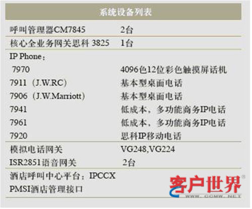 目前整個(gè)酒店IP電話系統(tǒng),采用兩個(gè)7845Call Manger,提供互相冗余備份。一套PMSI酒店管理接口,酒店呼叫中心平臺(tái):IPCCX,兩臺(tái)ISR2851語(yǔ)音網(wǎng)關(guān)。酒店還為每個(gè)客房提供一部7970彩屏IP終端,同時(shí)為了顧客的方便還在床頭還提供一部7906或者7911IP電話終端,足見(jiàn)酒店的體貼周到。酒店辦公管理和客服中心分別使用7941和7961,同時(shí)為了移動(dòng)方便,酒店還采用了Wi-Fi設(shè)計(jì),目前在酒店后臺(tái)管理采用了7920無(wú)線IP電話終端。