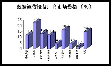 (1)市場規(guī)模: 年初各大運(yùn)營商IP實(shí)驗(yàn)網(wǎng)的開通以及聯(lián)通覆蓋300余城市的IP網(wǎng)絡(luò)大規(guī)模建設(shè),年中ChinaNet大提速與3期擴(kuò)容項(xiàng)目實(shí)施以及CNCnet開通,年末CMnet骨干網(wǎng)一期工程上馬、2000年中國數(shù)據(jù)通信設(shè)備市場可謂是熱點(diǎn)頻仍。根據(jù)Frost&Sullivan分析,年內(nèi)網(wǎng)絡(luò)交換機(jī)、訪問產(chǎn)品、 路由器、集線器等數(shù)據(jù)通信主要設(shè)備市場規(guī)模達(dá)到96億人民幣,同比增長36%,數(shù)據(jù)通信設(shè)備市場再次進(jìn)入高速增長期。