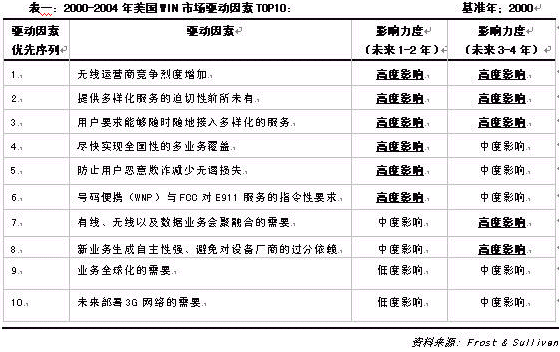 根據(jù)Frost & Sullivan 分析預(yù)測(cè),2000-2004年美國(guó)WIN設(shè)備市場(chǎng)呈現(xiàn)相對(duì)均衡的發(fā)展趨勢(shì),其TOP10的影響因素與影響力度見(jiàn)下表: