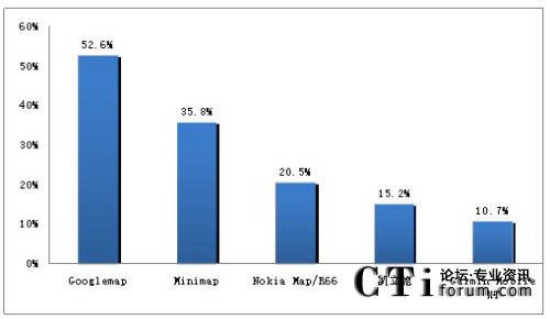 如圖1所示,在用戶占有方面,使用率最高的是谷歌的Googlemap,總計有52.6%的用戶使用該軟件;其次是高德的迷你地圖,使用率達(dá)35.8%,排名第二;Nokia