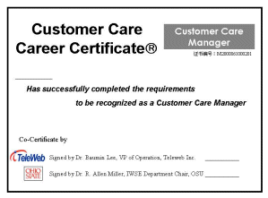 學(xué)員在經(jīng)過(guò)完整的課程培訓(xùn)之后,經(jīng)考試合格,可以獲得由美國(guó)俄亥俄州立大學(xué)與太維資訊有限公司聯(lián)合頒發(fā)的的專(zhuān)業(yè)培訓(xùn)證書(shū)?蛻(hù)服務(wù)中心認(rèn)證的目的有兩個(gè):首先,對(duì)于已經(jīng)在客服中心從業(yè)的人員,太維公司的培訓(xùn)可以提供一個(gè)提升他們工作能力的機(jī)會(huì),通過(guò)培訓(xùn)后不同層次的專(zhuān)業(yè)培訓(xùn)認(rèn)證,太維公司以行業(yè)的標(biāo)準(zhǔn)要求對(duì)他們的提升加以證明,以加強(qiáng)他們?cè)谛袠I(yè)中的競(jìng)爭(zhēng)能力。其次,對(duì)于有志致力于在客戶(hù)服務(wù)行業(yè)從業(yè)的人事,太維公司廣泛深入、滿足各種需求的專(zhuān)門(mén)技術(shù)培訓(xùn)與相應(yīng)的不同層次的認(rèn)證,為他們進(jìn)入該行業(yè)提供一個(gè)標(biāo)準(zhǔn)的素質(zhì)證明,以使他們能夠順利勝任客戶(hù)服務(wù)中心的各種主要的工作職位。
