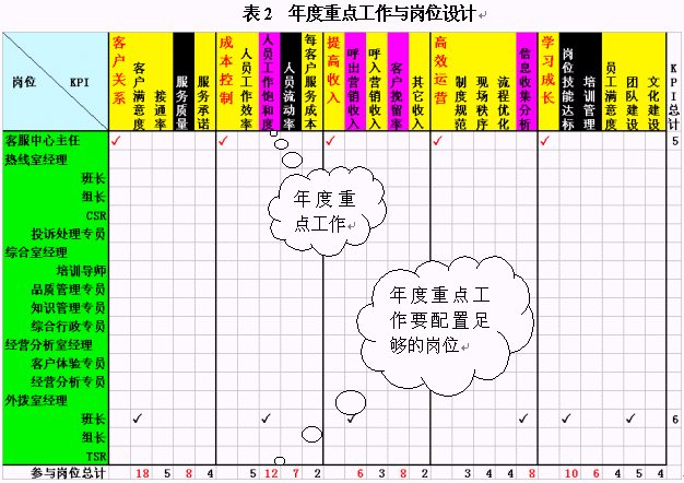 在這里,我們先以崗位設(shè)計(jì)來舉例。經(jīng)常有呼叫中心主管把每個(gè)崗位的職責(zé)都設(shè)計(jì)的非常詳細(xì),包括了每天來做什么,說什么,錄入什么,甚至是打掃某區(qū)域衛(wèi)生之類。但是,我看遍了每一條,也沒找到這個(gè)崗位應(yīng)該對什么業(yè)績"負(fù)責(zé)任",該對哪些工作做出貢獻(xiàn)。此處建議各位把效益評價(jià)體系、年度重點(diǎn)工作與崗位設(shè)計(jì)結(jié)合起來。如表2所示,我們可以把效益評價(jià)體系作為KPI放在橫坐標(biāo)中,而崗位設(shè)置則是縱坐標(biāo)。每個(gè)崗位對應(yīng)的行中,可以勾畫其應(yīng)負(fù)責(zé)或者做出主要貢獻(xiàn)的項(xiàng)目。這些項(xiàng)目不能超過6個(gè),因?yàn)樘嗟捻?xiàng)目會使得這個(gè)崗位無所適從,最終的結(jié)果是哪個(gè)也沒做好。當(dāng)你勾畫完成之后,請計(jì)算每列的"對勾"數(shù)目,看看你本年度的重點(diǎn)工作是不是有較多崗位負(fù)責(zé)呢?