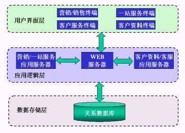 數(shù)據(jù)存儲層中以關(guān)系模型存儲了營銷管理、一站服務(wù)、客戶檔案與客戶服務(wù)功能模塊所需的客戶、業(yè)務(wù)數(shù)據(jù);應(yīng)用邏輯層的WEB服務(wù)器向用戶界面層的瀏覽器提供WEB訪問服務(wù),應(yīng)用服務(wù)器上的程序完成實際的業(yè)務(wù)邏輯,并將需向前臺返回的結(jié)果從數(shù)據(jù)庫中取出,交給WEB服務(wù)器;而前端的用戶界面層負(fù)責(zé)向用戶展現(xiàn)最終的處理結(jié)果。