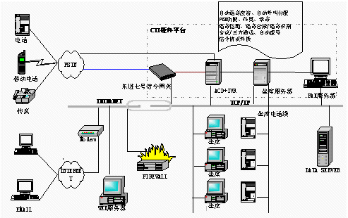 電信1000號客戶服務(wù)中心,集成了計算機(jī)網(wǎng)絡(luò)技術(shù)和計算機(jī)語音集成技術(shù)(CTI)。系統(tǒng)結(jié)構(gòu)可分為三部分:CTI硬件平臺、LAN網(wǎng)絡(luò)平臺、客戶服務(wù)軟件系統(tǒng)。東進(jìn)公司推出了基于板卡的CTI硬件方案,以七號信令網(wǎng)關(guān)進(jìn)行協(xié)議轉(zhuǎn)換。此硬件平臺具有以下優(yōu)點(diǎn):