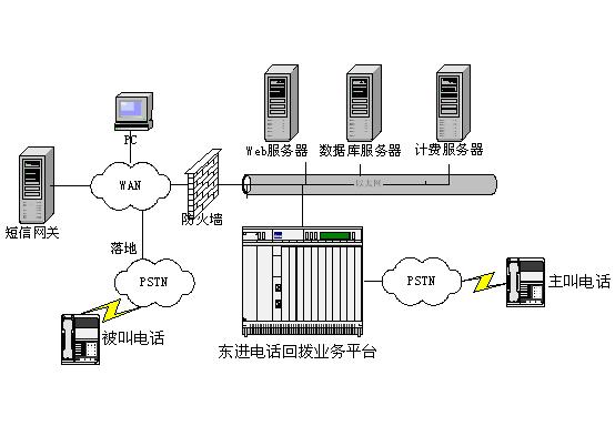 東進電話回撥平臺是業(yè)務的核心部分,完成電路接續(xù)、交換、IVR流程控制等功能,通過TCP/IP通訊協(xié)議與局域網(wǎng)絡中的后臺的計費服務器、數(shù)據(jù)庫服務器、Web服務器以及維護管理終端等設備交換信息。