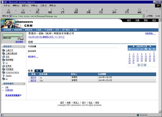 星際(杭州)網(wǎng)絡技術有限公司(www.ebanswers.com)研發(fā)的Ebanswers eCRM是中國第一套基于新一代網(wǎng)絡標準語言――XML的客戶關系管理系統(tǒng),整個系統(tǒng)提供了完善的企業(yè)級客戶關系全面解決方案,包含可無縫整合又可獨立運行的三個功能組件:銷售,營銷,服務流程自動化軟件系統(tǒng);客戶溝通集成信息化方案;深層商業(yè)智能分析。