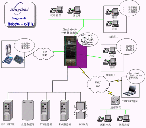ZingServ®平臺(tái)的WEB呼叫/Chat 功能主要面向Internet用戶,用戶可通過(guò)Modem撥號(hào)、DDN專(zhuān)線、ISDN撥號(hào)、局域網(wǎng)、ADSL、Cable