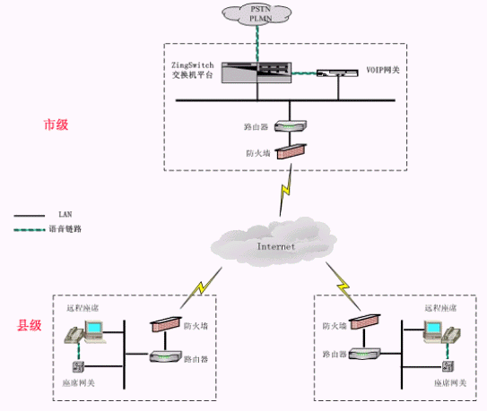 系統(tǒng)在市中心點(diǎn)和分布的遠(yuǎn)程座席所在縣市區(qū)分別部署相應(yīng)的VoIP網(wǎng)關(guān),市中心和各個(gè)縣市區(qū)都通過互聯(lián)網(wǎng)進(jìn)行連接和語(yǔ)音傳輸,客戶與遠(yuǎn)程座席之間的交流與普通的集中座席員之間毫無(wú)區(qū)別,遠(yuǎn)程座席只相當(dāng)于ZingSwitch交換機(jī)的一個(gè)遠(yuǎn)程分機(jī)。