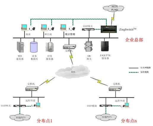 - 系統(tǒng)仍可同時在總部設立VoIP中心,用以實現(xiàn)數據和管理的集中,并且采用VoIP的方式,對各分布點的話務工作進行集中的監(jiān)控。