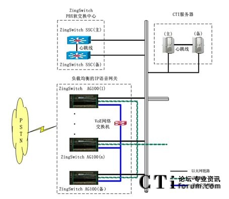 同時(shí)基于ZingSwitch® CVNET平臺(tái)的系統(tǒng)網(wǎng)絡(luò)架構(gòu)中,AG100(IP語音網(wǎng)關(guān))自身具有99.999%的高穩(wěn)定性外,具有負(fù)載均衡能力保證語音接續(xù)的不中斷。