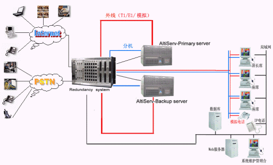 奧迪堅通訊系統(tǒng)有限公司作為CTI通訊平臺的提供商,在技術上不斷創(chuàng)新,對產(chǎn)品精益求精,尤其體現(xiàn)在對系統(tǒng)的運行安全性的要求上,為了防止電信接入設備或者企業(yè)網(wǎng)絡出現(xiàn)故障而造成的呼叫中心服務中斷,奧迪堅呼叫中心系統(tǒng)提供安全保護冗余切換系統(tǒng),來保障呼叫中心在意外情況下的正常工作,該安全冗余切換系統(tǒng)通過對電源、T1/E1、模擬trunk、分機座席、以及各種網(wǎng)絡鏈路串口等備份切換來實現(xiàn)可靠的運行。除此之外,奧迪堅系統(tǒng)本身也提供強大的安全保障,由于采用先進IP內核一體化設計,集傳統(tǒng)PBX、CTI服務器、IVR、ACD、Recording、FAX等眾多設備于一體,這樣有效的避免了因為外掛設備過多以及設備供應商的不同而存在的兼容性的問題,從而降低了給呼叫中心系統(tǒng)帶來的的不穩(wěn)定的安全隱患。在系統(tǒng)之外依靠安全保護冗余切換系統(tǒng),可以實現(xiàn)外線、分機、以及各種鏈路接口的雙倍安全運行。如上圖所示:兩臺奧迪堅的呼叫中心服務器和奧迪堅安全冗余切換系統(tǒng)構成呼叫中心熱備份系統(tǒng),在兩臺服務器中安裝所有的呼叫中心功能模塊。通常情況下由主呼叫中心服務器提供系統(tǒng)的正常運行,備份服務器通過安全保護冗余切換系統(tǒng)的服務監(jiān)測模塊來監(jiān)測主服務器的各項設備和鏈路的使用情況,當主服務器遭遇突發(fā)故障不能繼續(xù)工作時,系統(tǒng)馬上實施自動切換,就會通過安全保護冗余切換系統(tǒng)將系統(tǒng)切換到備份的呼叫中心系統(tǒng)上來,此鏈路可以是數(shù)據(jù)、語音、網(wǎng)絡、串口等。當安全保護冗余切換系統(tǒng)自身出現(xiàn)斷電或者其他故障時,所有鏈路均保持正常工作狀態(tài)。