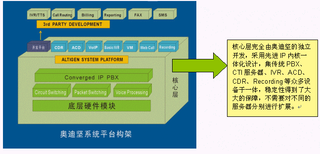 交換功能作為整個(gè)系統(tǒng)的核心功能,是系統(tǒng)一切功能的基礎(chǔ)。奧迪堅(jiān)高度一體化通訊服務(wù)器AltiServ,采用先進(jìn)的DSP等技術(shù),將傳統(tǒng)的語音交換和IP包交換在系統(tǒng)底層實(shí)現(xiàn),使系統(tǒng)的技術(shù)水平、功能及穩(wěn)定性達(dá)到了一個(gè)新的高度,可以實(shí)現(xiàn)大容量電話的呼入/呼出處理、電話轉(zhuǎn)接、支持PRI、E1、中國一號(hào)信令、七號(hào)信令、模擬線路等多種接入方式,同時(shí)還具備傳統(tǒng)PBX所不具備的強(qiáng)大的語音信箱、電話會(huì)議功能、VoIP、界面友好的系統(tǒng)管理功能等。由于在底層對(duì)VoIP支持,所以既可以使用普通電話機(jī),也可以使用IP話機(jī)或者軟電話登陸到系統(tǒng),豐富了用戶的選擇的范圍,方便了用戶使用并節(jié)省投資,并且VoIP技術(shù)擴(kuò)展了增值空間,可以用IP座席輕松構(gòu)建遠(yuǎn)程專家座席,更加適合互聯(lián)網(wǎng)時(shí)代的應(yīng)用。