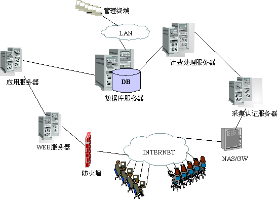 根據(jù)以上體系結(jié)構(gòu),寬帶IP城域網(wǎng)計費與業(yè)務(wù)管理系統(tǒng)的運行平臺結(jié)構(gòu)如圖所示: