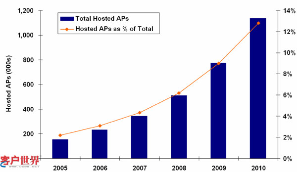 根據(jù)datamonitor在2006年的分析,自2005年起,全球呼叫中心托管的總數(shù)約二十萬個(gè)座席,占全球呼叫中心的總座席數(shù)得2%,到2008年成長到約五十萬個(gè)座席,占總量的6%左右,在2010年時(shí)更會成長到超過一百萬個(gè)座席占總數(shù)的10%左右。所以整個(gè)托管市場來說將會持續(xù)不斷的成長(見圖二)。