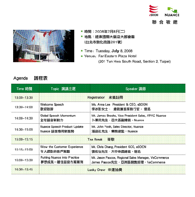 2008“Nuance語音技術高峰論壇”臺北站7月8日將于遠東國際大飯店舉行