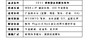 CESS消費型服務(wù)軟件具有經(jīng)濟實惠、選擇多樣、簡單快捷、配套自選、綠能環(huán)通路廣泛等特點,采用Web+IP的潮流科技,AIO節(jié)省投資,使軟件經(jīng)濟實惠;CESS軟件產(chǎn)品線齊全,涵蓋客服、銷售、財務(wù)、行政、OA等很多方面,給您多樣選擇;WYSIWYG(所見即所得)導(dǎo)向,業(yè)務(wù)流程DIY,讓您至需要動動鼠標就可以DIY您想要得到的設(shè)計,不再需要麻煩IT人員,只管實用,簡單快捷;輕松Plug-in & Hook其它應(yīng)用與通信環(huán)境,可根據(jù)您的需要配套自選;節(jié)能減碳、省話費、省空間,綠色環(huán)保;經(jīng)銷體系健全、提供優(yōu)質(zhì)服務(wù),通路廣泛。