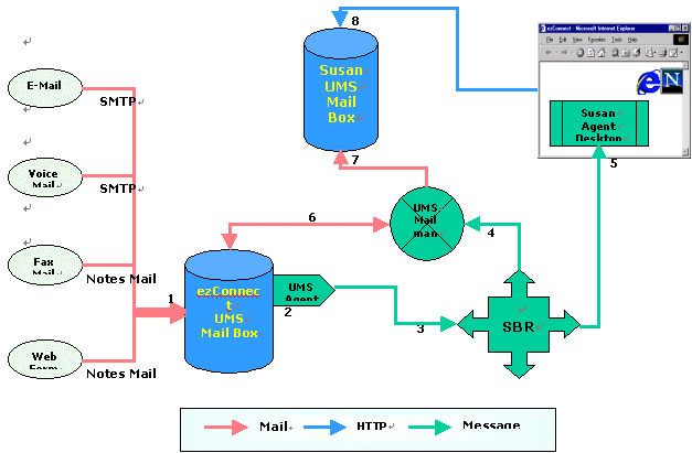 各類外部語音、郵件、WEB、傳真等信息進入呼叫中心會以相應(yīng)的格式直接被放入ezConnect統(tǒng)一郵件服務(wù)器(1),消息經(jīng)過UMS Agent 模塊被提取出信息主題和關(guān)鍵字(2),這些主題和關(guān)鍵字被送入基于技能的路由選擇模塊SBR(3),由SBR進行分析,選擇出最合適服務(wù)的座席(例如是Susan);之后SBR通知郵件轉(zhuǎn)發(fā)器(4)去ezConnect統(tǒng)一郵件服務(wù)器中取相應(yīng)的郵件(6),將郵件放入最佳座席(Susan)的UMS信箱中(7)(8),與此同時座席Susan的界面上顯示出她有一封新的郵件(5)。至此,完成了座席Susan 接收UMS信件的全過程。