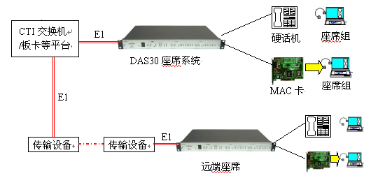 見下圖:DAS30通過1個E1接口與交換機/板卡直接連接,無需配置數據,可方便地實現本地座席接入或遠端分布式接入(需配合傳輸設備)。終端可為普通電話機或MAC座席電話卡。
