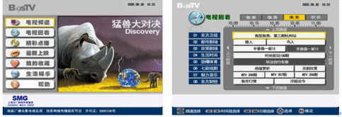 上海IPTV業(yè)務(wù)自2006年9月1日放號以來,發(fā)展十分迅速。截止10月7日,上海電信IPTV業(yè)務(wù)共計(jì)發(fā)展用戶達(dá)2.2萬。如下是上海IPTV商用系統(tǒng)EPG頁面: