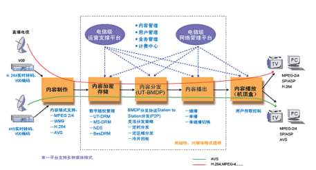 奔流(RollingStream)系統(tǒng)為IPTV業(yè)務(wù)提供了端到端的業(yè)務(wù)解決方案,先進(jìn)的系統(tǒng)架構(gòu)對Codec完全透明,可透明支持AVS,如下圖。奔流(RollingStream)系統(tǒng)包括內(nèi)容制作、內(nèi)容存儲(chǔ)/加密、內(nèi)容分發(fā)、內(nèi)容播放、終端顯示的各個(gè)方面,都可提供基于電信級的解決方案。