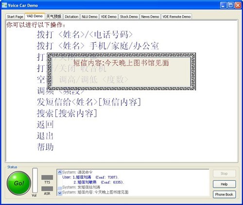 Nuance:可以修改。到你需要修改的那個“見”上,你再說“見”或者見面,它就給你弄過來了。但是我們覺得在中國區(qū),在中文的修改上,這未必可能是個好辦法,我們也在試探另外一種辦法,這個辦法我現(xiàn)在可以給大家介紹一下。就是這樣,我要說修改,那么那個語音合成TS就開始給你再讀,剛才不是讀了一遍嗎,它再給你讀,但是這一次讀,它是一個詞一個詞地讀。他說,今天我不吭聲,晚上,我不吭聲,他說七點(diǎn),我也不吭聲,等他說“見”的時候,我說“見面”,他知道我說的這個詞要把那個覆蓋掉,再改,再把它改了。這樣可能更合理一些,就是你手不用去摸什么東西,眼睛看什么東西,完全能保持你在駕駛的時候,這是我們目前還在進(jìn)行開發(fā)的一個東西,或許下一次如果我們再有機(jī)會我們就可以把這個演示一下。