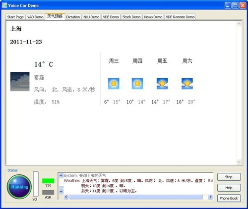 比方說這個關(guān)于空調(diào)問題,我們過去,空調(diào)的命令詞是“把空調(diào)打開,空調(diào)溫度提高3度!爆F(xiàn)在我也可以這樣說,空調(diào)調(diào)高一點(diǎn),我有點(diǎn)冷,也可以。就是你在車?yán)镞呁耆梢杂媚阕约旱恼Z言來說你想干的事。比如說,前邊你不知道明天天氣會怎么樣,人一般都會想想,明天天氣如何,或者是告訴我天氣預(yù)報。但是你也可以這樣說。明天會下雨嗎?也可以這樣說;蛘吣氵@樣說,你說,今天大盤怎么樣。完全是用自然語言來說。堵不堵車,“查詢交通情況!边@就是,實(shí)際上可以有各種不同的說法來完成這個任務(wù),這是我們自然語言的一個演示。