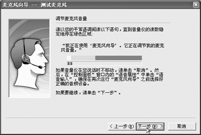 待音量儀式穩(wěn)定后,點擊“下一步”測試麥克風(fēng)的安放位置,再次朗讀對話框中的例句,然后聽一下回放的錄音是否清晰。一切調(diào)整好后,點擊“完成”。