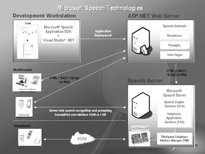 上圖中的Speech Server就是微軟的Web語音平臺,可以看到它連接起了電話網絡(PSTN)以及Web Server。