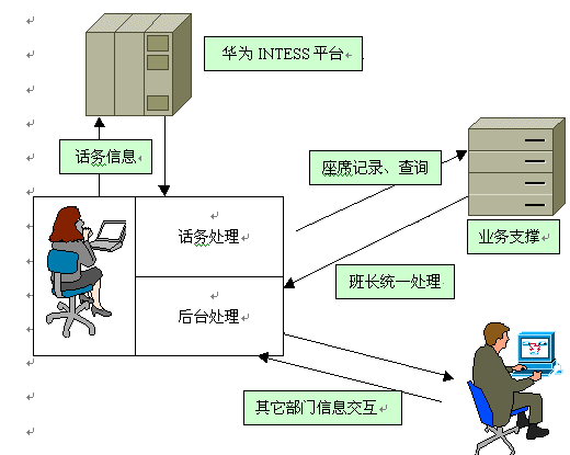 該系統(tǒng)在鐵通CRIS 平臺上運行,前端接入采用華為CC08-A型排隊機,華為INTESS平臺,集成正邦高科座席軟件。完成企業(yè)業(yè)務(wù)咨詢、投訴建議的受理、產(chǎn)品訂購、外呼調(diào)查等業(yè)務(wù),并針對各業(yè)務(wù)的特色規(guī)劃了企業(yè)的業(yè)務(wù)流程。正邦高科客戶服務(wù)系統(tǒng)的坐席軟件,和華為INTESS采用緊耦合方式將話務(wù)信息和業(yè)務(wù)信息結(jié)合在一起,便于統(tǒng)計分析,制訂客戶服務(wù)中心的運營策略。在后臺業(yè)務(wù)管理系統(tǒng)中,客戶服務(wù)系統(tǒng)設(shè)計了便于分析業(yè)務(wù)的一系列統(tǒng)計報表,使企業(yè)可以方便地對銷售過程進(jìn)行跟蹤和定單派發(fā)。