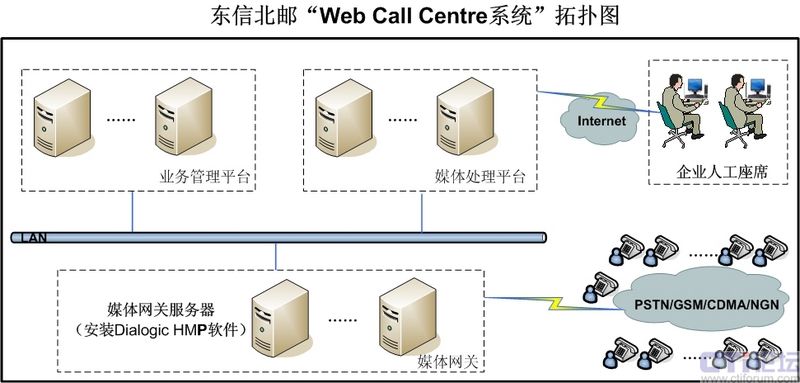 隨著中國(guó)經(jīng)濟(jì)的快速發(fā)展,越來越多的企業(yè)尤其是中小企業(yè)對(duì)呼叫中心的需求量越來越大,需求質(zhì)量也越來越高。由于呼叫中心建設(shè)涉及技術(shù)十分專業(yè)、涉及領(lǐng)域也比較廣泛、必須投入巨大的資金購(gòu)買軟硬件設(shè)備,并且需要大量的維護(hù)力量,因此對(duì)于中小企業(yè),尤其是缺乏專業(yè)技術(shù)力量和資金的中小企業(yè)來說,建設(shè)自有的呼叫中心顯得不切實(shí)際。正是基于這種情況,EB開始與Dialogic合作,采用其HMP系統(tǒng)軟件,以IP技術(shù)為基礎(chǔ),依托電信網(wǎng)絡(luò),建設(shè)呼叫中心系統(tǒng),以托管方式為客戶提供呼叫中心服務(wù),即Web Call Centre服務(wù)。