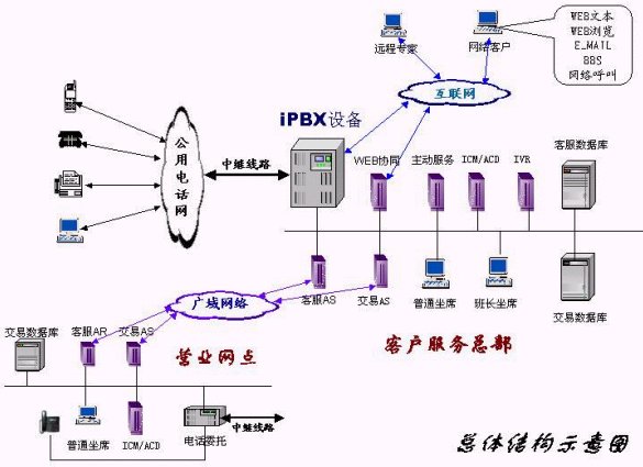 在總部設立集中的客戶服務中心完成對全網的人工座席的管理和調度,由總部的ACD完成對全網人工業(yè)務的呼叫分配,借助廣域網絡,實現(xiàn)話務在區(qū)域范圍內的接續(xù)。在座席配置上既可以采用集中配置,各營業(yè)部分散配置專家座席的方式。