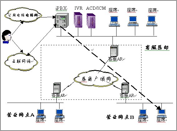 所有人工業(yè)務請求由總部的ACD根據(jù)客戶的開戶營業(yè)網點等屬性將話務分配給具有相應服務技能和營業(yè)網點的本地或遠端座席上。