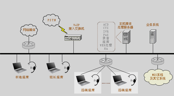 在本次客戶服務(wù)中心系統(tǒng)升級(jí)中,我們采用了更加先進(jìn)的第四代呼叫中心系統(tǒng)作為客服系統(tǒng)的平臺(tái)?梢詫(shí)現(xiàn)的客戶聯(lián)絡(luò)方式已經(jīng)不僅僅局限于傳統(tǒng)的語音和傳真的呼叫形式,網(wǎng)絡(luò)電話、網(wǎng)絡(luò)傳真、Email、短消息、即時(shí)消息、互聯(lián)網(wǎng)應(yīng)用等都是與客戶聯(lián)絡(luò)的重要方式,涉及到的媒體載體也不僅是PSTN,還有基于VoIP技術(shù)的現(xiàn)代網(wǎng)絡(luò)、無線網(wǎng)絡(luò)等;也就是說第四代呼叫中心系統(tǒng)是一個(gè)融合網(wǎng)絡(luò)、語音、數(shù)據(jù)庫、視頻和安全技術(shù)的綜合信息服務(wù)平臺(tái)。系統(tǒng)結(jié)構(gòu)圖如下: