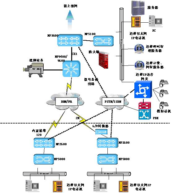 目前許多公安系統(tǒng)雖然采用具有IP語音功能的路由設備組建網(wǎng)絡,但在業(yè)務語音交流通常還通過PBX集團交換機走電信PSTN/ISDN電話網(wǎng),這樣無法節(jié)省電話費用,反而增加了辦公費用。邁普IP語音解決方案采用了邁普MyPower VG2000IP語音網(wǎng)關(guān)和邁普以太網(wǎng)IP電話進行改造。在整個網(wǎng)點語音終端全部設備選用經(jīng)濟型邁普以太網(wǎng)IP電話機,它采用雙以太口設計,使網(wǎng)絡無需重新布線,同時也可使用已有的路由器上IP語音模塊;邁普以太網(wǎng)IP電話機之間的話音通信通過邁普呼叫管理服務器集中控制。在主體IP網(wǎng)絡中,邁普IP語音網(wǎng)關(guān)放置于中心機房作為傳統(tǒng)PSTN的出口,可以通過VOS接口、E1接口(中國一號信令)、E&M接口等多種方式接入公安PBX,將PSTN線路傳來的時分話音或傳真信息進行分組和壓縮,轉(zhuǎn)換成IP數(shù)據(jù)包,通過路由設備路由到目的地;在沒有PBX的公安機房,邁普IP語音網(wǎng)關(guān)可以提供32路的模擬用戶接口,可以完全替代傳統(tǒng)PBX并接入PSTN,并提供額外功能,如圖中虛線所示;整個方案還可以針對公安用戶特殊需求"定做"特色功能,例如緊急告警等方便日常辦公。