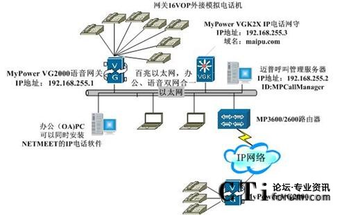 在這種應(yīng)用中,用戶通過IP網(wǎng)絡(luò)接入以太網(wǎng)IP電話機(jī)的同時,還可以在MyPower VG2000 IP語音網(wǎng)關(guān)上插入兩張16VOP IP電話模塊,接32個普通電話機(jī)。這32個電話機(jī)就像其它以太網(wǎng)IP電話機(jī)一樣可以和其它IP網(wǎng)上的IP電話機(jī)互相呼叫,此時,我們把MyPower VG2000 IP語音網(wǎng)關(guān)作為一個小型的PBX接入平臺。