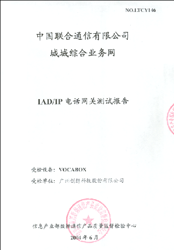 。。近日,廣州創(chuàng)想科技股份有限公司得到信產(chǎn)部數(shù)據(jù)通信產(chǎn)品質(zhì)量監(jiān)督檢測中心的通知:VOCABOX/IAD通過了中國聯(lián)通城域綜合業(yè)務網(wǎng)IAD/IP電話語音網(wǎng)關入圍測試。