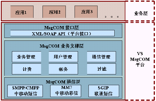 上海聲軟公司(www.voicesoft.com.cn)的MsgCOM通信平臺在國內(nèi)創(chuàng)造性地將業(yè)務和平臺分開,利用先進的XML/SOAP技術進行二次開發(fā)定制業(yè)務應用,以下是它的系統(tǒng)邏輯結構圖: