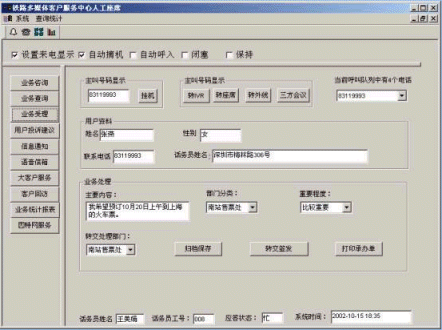 客戶服務中心系統(tǒng)將為鐵路局提供強勁的客戶關(guān)系管理能力,自動業(yè)務導航能力,交互式協(xié)作能力,并可通過基于各業(yè)務代表技能特點的路由選擇,將客戶來話接到最符合要求的業(yè)務代表處,對于老客戶還可以建立一對一的關(guān)系,將老客戶的來話直接接到以前曾與之通過話的業(yè)務人員處,使其倍感親切。同時,高度集中的客戶服務中心可以使鐵路部門用最低成本向旅客、貨主提供最有保證的服務和支持,不論在商機管理、客戶服務、還是顧客群維系等諸多方面,都是客戶服務中心發(fā)揮其巨大作用的領(lǐng)域。鐵路部門充分利用客戶服務中心的優(yōu)勢,可以帶來無限商機,通過電話回訪等手段,既能樹立良好的企業(yè)形象,又能提供完善的服務。這樣對增強客戶忠誠度,保持原有的客戶群,降低顧客流失率和擴大新的顧客群都將起到很好地作用。