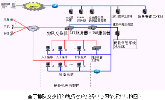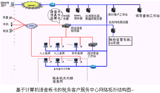 本系統(tǒng)提供基于計(jì)算機(jī)語(yǔ)音板卡和交換機(jī)兩種語(yǔ)音接入方式,都支持1號(hào)和7號(hào)信令線路的接入。對(duì)于20個(gè)以下人工座席的中小型稅務(wù)客戶服務(wù)中心系統(tǒng),則建議使用基于計(jì)算機(jī)語(yǔ)音板卡的方式,可以減少投資,同時(shí)具有良好的系統(tǒng)性能;對(duì)于大型的稅務(wù)客戶服務(wù)中心系統(tǒng),可選用排隊(duì)交換機(jī)作為語(yǔ)音接入設(shè)備,以保障系統(tǒng)的高可靠性和穩(wěn)定性。