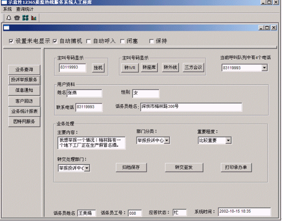 12365質(zhì)監(jiān)熱線服務(wù)系統(tǒng)將接入功能、導(dǎo)航功能、交互式語音應(yīng)答服務(wù)功能、人工座席服務(wù)功能、話路轉(zhuǎn)接功能、信息資料處理緊密聯(lián)系起來。用戶撥打特服電話號碼后,可以根據(jù)需要選擇人工服務(wù)、交互式語音應(yīng)答服務(wù)、自動留言,并能夠在幾種服務(wù)中來回切換或轉(zhuǎn)接其它電話;所記錄的資料可以分門別類的進(jìn)行統(tǒng)計(jì)并形成報(bào)表,供相關(guān)部門進(jìn)行檢索查閱;意見處理完畢,可由座席主動呼叫用戶,告知處理意見,形成閉環(huán)處理流程。