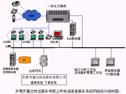 48個人工座席,落單組為30個人工座席(其中1個為落單組班長座席),查詢組為18個人工座席(其中1個為查詢組班長座席),48路全程同步錄音(可以實時設置或取消),64路IVR, 24路TTS通道,4路傳真,64條模擬中繼線路接入,支持普通話、廣東話等多語種服務的語音合成(TTS);提供各種話音、傳真集成服務,提供辦公時間服務流程與非辦公時間服務流程,人工服務落單,自助落單,貨物在途狀況人工服務查詢,貨物在途狀況自助查詢,業(yè)務咨詢,語音信箱,傳真服務等業(yè)務功能,實現與后臺下單系統(tǒng),貨物在途狀況查詢系統(tǒng),GPS系統(tǒng)等的無縫集成,為客戶提供24小時全天候的快捷優(yōu)質服務。