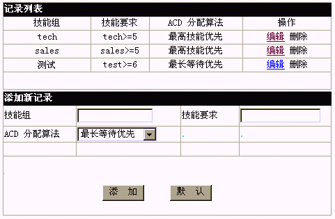 設(shè)置技能組:定義一個(gè)技能組名稱(chēng),給出一項(xiàng)技能的值范圍表達(dá)式,凡具備該技能且技能值屬于該范圍的座席,將自動(dòng)加入該技能組。