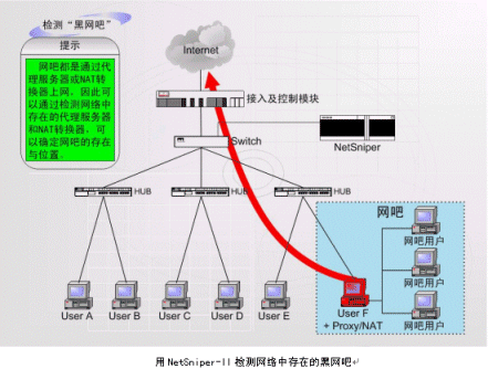 上圖中,NetSniper-II可以對網(wǎng)絡內部各用戶進行檢測,一旦發(fā)生某個用戶安裝代理服務器軟件,其他用戶通過該用戶的接口上網(wǎng)偷逃網(wǎng)費的情況,或發(fā)現(xiàn)盜用MAC地址上網(wǎng)及通過Modem回撥上網(wǎng)的情況,NetSniper-II即可定位這些用戶,并且采取通知系統(tǒng)管理員或自動封堵非法用戶等措施。