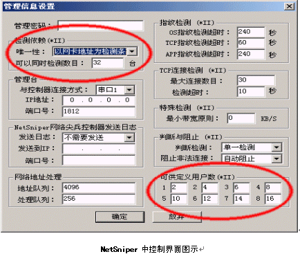 由上圖我們可以看出,NetSniper可以方便地根據(jù)用戶IP地址或MAC地址控制同一網(wǎng)口用戶數(shù)量,用戶數(shù)量控制可以分八級,包括單一用戶和無限用戶的缺省設置,一共十級。用戶數(shù)量按照按自己的意愿定義每一級用戶可以管理計算機的數(shù)量,準確,靈活,是運營商增加接入服務方式的強大基礎。