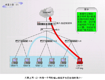 非法運營情況之二:如上圖中的F用戶作為運營商的合法包月用戶,上網(wǎng)服務開通以后,在自己的計算機中安裝代理服務軟件或者安裝路由器,這樣就可以隨時糾集若干住戶分攤包月費用,甚至私設網(wǎng)吧。