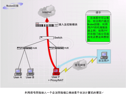 這是在企業(yè)網(wǎng)絡中常見的情況:如上圖中的F用戶作為企業(yè)的合法用戶,上網(wǎng)服務開通以后,有操作人員在F計算機中安裝代理服務軟件、NAT軟件或者安裝路由器軟件,再安裝Modem等遠程接入設備。非法用戶在遠端通過Modem等接入設備與網(wǎng)絡相連接。