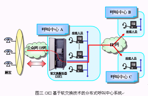 現(xiàn)在以O(shè)KI的軟交換呼叫中心為例,來(lái)分析一下軟交換技術(shù)在呼叫中心領(lǐng)域的應(yīng)用特色。從圖中我們可以看出,OKI的軟交換技術(shù)是基于SIP協(xié)議開(kāi)發(fā)的。構(gòu)架在Internet基礎(chǔ)上的SIP協(xié)議,符合Internet 開(kāi)放、分布和發(fā)展的網(wǎng)絡(luò)需求,而且對(duì)多媒體(電話、傳真、電子郵件等)接入支持支持,有著明顯的優(yōu)勢(shì)。事實(shí)上,由于支持SIP協(xié)議的呼叫中心無(wú)需憂慮大話務(wù)量對(duì)核心網(wǎng)絡(luò)服務(wù)器的大負(fù)載要求,呼叫處理的工作效率也將得到明顯的提升。目前中國(guó)國(guó)內(nèi)跨區(qū)域提供客戶服務(wù)企業(yè)數(shù)量正在不斷增長(zhǎng),在此背景下,分布式呼叫中心脫穎而出。它不僅有利于企業(yè)分支機(jī)構(gòu)的擴(kuò)展或轉(zhuǎn)移,支持分布式的組織結(jié)構(gòu)和系統(tǒng)運(yùn)作,還能有效利用地域之間的資源差別,如數(shù)據(jù)資源、人力資源、成本資源,使企業(yè)的可利用資源得到最充分有效的利用和統(tǒng)一管理。而SIP協(xié)議本身具備的分散特性,使軟交換技術(shù)在構(gòu)建VoIP的分布式呼叫中心上有著無(wú)可比擬的優(yōu)勢(shì)。