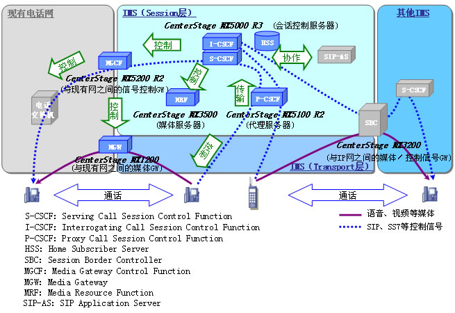 CenterStage NX系列的主要特點(diǎn)   具有S-CSCF、I-CSCF、HSS(注11)、BGCF(注12)及以往IP電話服務(wù)功能的會(huì)話控制服務(wù)器。能為SIP入網(wǎng)用戶收容移動(dòng)終端及固定終端。大容量(1個(gè)服務(wù)器:能收容80萬(wàn)門電話線路,ATCA機(jī)架最大安裝配置時(shí):可以收容480萬(wàn)門電話線路);高性能(1個(gè)服務(wù)器:100萬(wàn)BHCA(注13)、ATCA機(jī)架最大安裝配置時(shí):600萬(wàn)BHCA)。   具有P-CSCF功能的會(huì)話控制服務(wù)器。大容量(1個(gè)服務(wù)器:能收容80萬(wàn)門電話線路,ATCA機(jī)架最大安裝配置時(shí):可以收容480萬(wàn)門電話線路);高性能(1個(gè)服務(wù)器:100萬(wàn)BHCA、ATCA機(jī)架最大安裝配置時(shí):600萬(wàn)BHCA)。   具有MGCF、HSS、BGCF及電話中繼功能的呼控制服務(wù)器。能提供將NGN網(wǎng)與以往電話網(wǎng)無(wú)縫連接功能。大容量(1個(gè)服務(wù)器:能收容8萬(wàn)門電話線路,ATCA機(jī)架最大安裝配置時(shí):可以收容48萬(wàn)入網(wǎng)用戶);高性能(100萬(wàn)BHCA,ATCA機(jī)架最大安裝配置時(shí):600萬(wàn)BHCA)。   具有根據(jù)來(lái)自CSCF的要求,送出固定及可變指示功能的語(yǔ)音系媒體服務(wù)器。通過(guò)IVR(注14)功能可以提供各種指示服務(wù)。   通過(guò)來(lái)自MGCF的控制指令,進(jìn)行VoIP與線路交換網(wǎng)之間的媒體(語(yǔ)音)變換的網(wǎng)關(guān)。大容量(最大安裝配置時(shí):可以收容16000入網(wǎng)用戶);高性能(最大安裝配置時(shí):50萬(wàn)BHCA)。