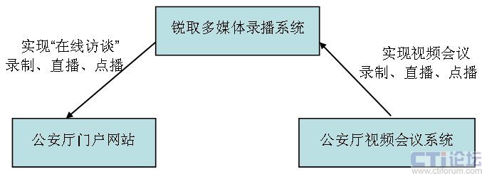 如圖所示,銳取多媒體錄播系統(tǒng)前端的視音頻編碼器采集視頻會(huì)議系統(tǒng)攝像機(jī)拍攝的公安機(jī)關(guān)領(lǐng)導(dǎo)或?qū)<以诰(xiàn)交流的視頻圖像和交流現(xiàn)場(chǎng)的聲音,將采集的視頻和音頻信號(hào)通過(guò)網(wǎng)絡(luò)傳輸?shù)胶笈_(tái)的多媒體錄播服務(wù)器中。服務(wù)器的錄制模塊將從視音頻編碼器接收到的信號(hào)進(jìn)行同步組合錄制,錄制的文件存儲(chǔ)在服務(wù)器的硬盤(pán)上。服務(wù)器的點(diǎn)播模塊調(diào)用硬盤(pán)中已錄制的文件實(shí)現(xiàn)點(diǎn)播功能。服務(wù)器的直播模塊將從視音頻編碼器接收到的信號(hào)分發(fā)到網(wǎng)絡(luò)上,需要觀看“在線(xiàn)訪談”直播視頻的網(wǎng)民只需登錄省公安廳政府門(mén)戶(hù)網(wǎng)站,安裝專(zhuān)用客戶(hù)端軟件就能接收到公安機(jī)關(guān)領(lǐng)導(dǎo)或?qū)<以诰(xiàn)交流的實(shí)時(shí)內(nèi)容。通過(guò)客戶(hù)端軟件的在線(xiàn)交流功能,觀看直播的網(wǎng)民還可以向公安機(jī)關(guān)領(lǐng)導(dǎo)或?qū)<姨釂?wèn),真正實(shí)現(xiàn)了“在線(xiàn)訪談”貼近群眾、服務(wù)群眾的目標(biāo)。